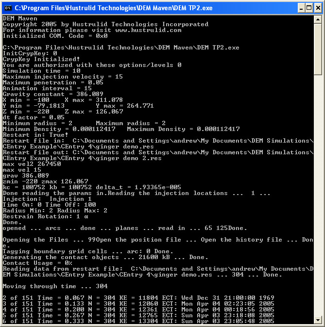As the simulation progresses a restart file is automatically output every second of modeling time so you can visually see the progression of the simulation in the Chute Maven program. An Expected Completion Time (ECT) is also displayed so you can plan your next run.